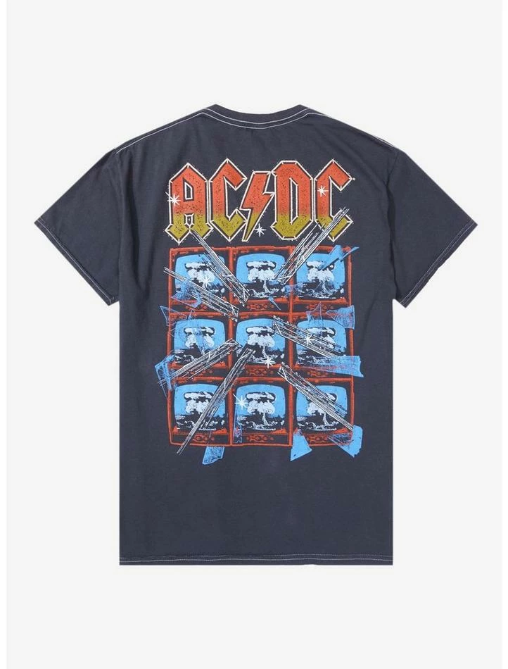 Getting ready to rock and roll? Throw on this AC/DC tee commemorating their Blow Up Your Video (1988) album. It shows Angus Young in his signature outfit bursting through a wall of TVs.