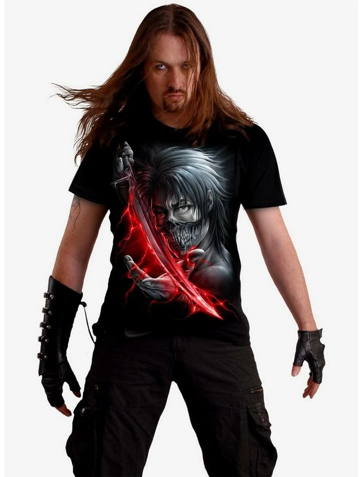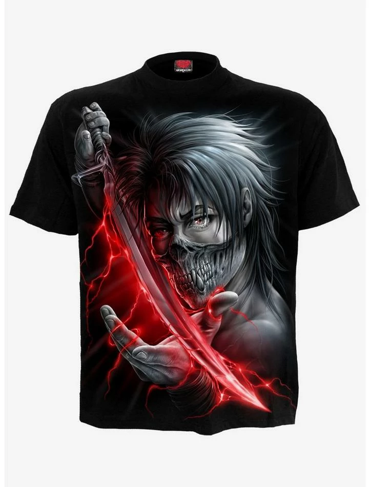 The devil resides in the actions of corrupt hearts. A mask may hide bad intentions, but as soon as the mask slips, the horror is revealed. Evil incarnate draws his blade, poised to bury it deep into its crimson target. And then silence. T-Shirt Black is made of top quality 100% cotton, jersey using skin friendly, Azo-free, reactive dyes.