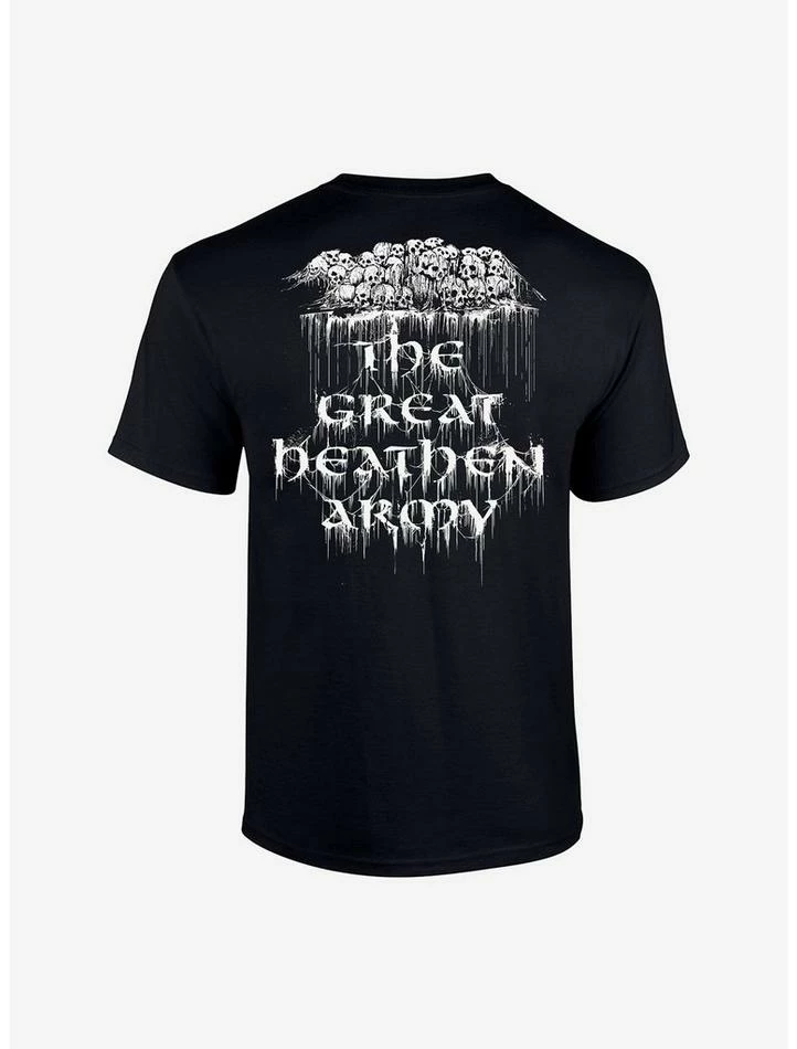 Can’t stop headbanging to Amon Amarth’s latest LP The Great Heathen Army (2022)? Same here. Grab a tee to honor the album featuring an army of undead Viking soldiers on the front, and the album title on the back.