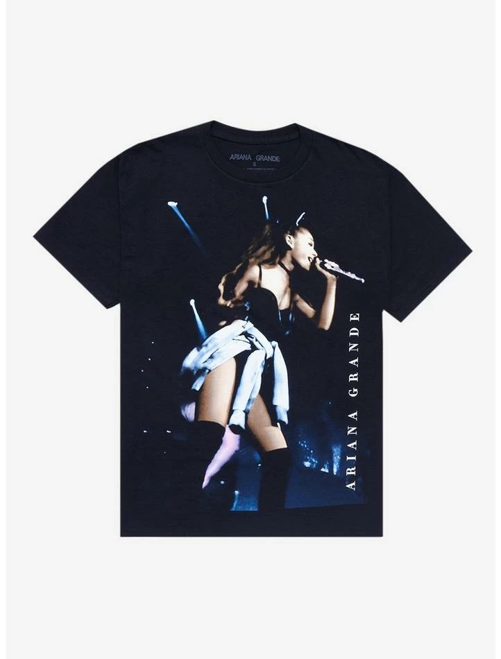 Ariana Grande’s voice is unmatched — even live. This tee shows a photo of the artist on stage, with her name down the side.