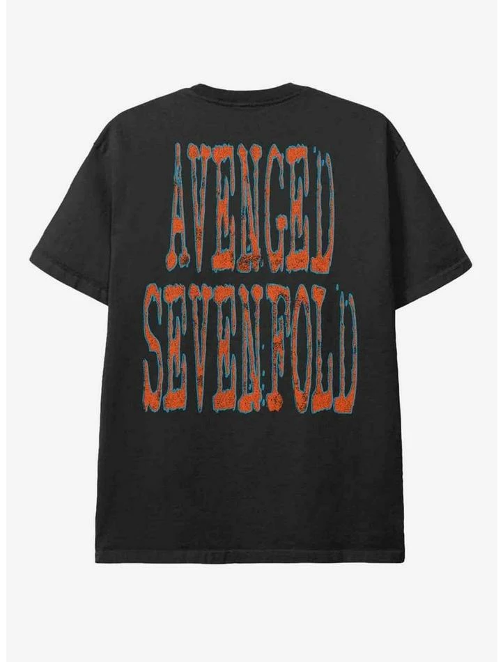 Grab a new Avenged Sevenfold tee while you wait for the band’s new album to drop! This style features a rad graphic of a skull with bat wings over a globe, surrounded by lightning. The band’s alt name A7X is printed in the background.