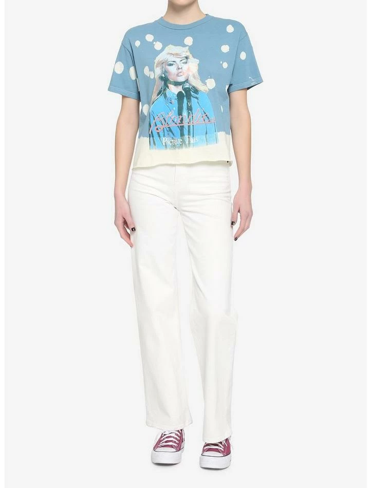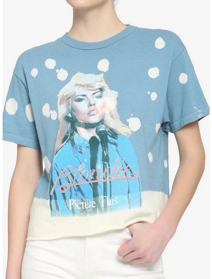 And you will def be a sight to see in this cropped Blondie tee! Featuring bleach wash detailing, a raw hem and an image of Debbie Harry with a mic and the band’s logo with “Picture this” underneath.