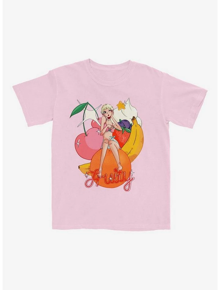 If “Fruity” by Chloe Moriondo is one of your current anthems, you need this supercute tee. It features an anime-style drawing of the artist sitting on a bunch of fruit with whipped cream on top, and the track name below.