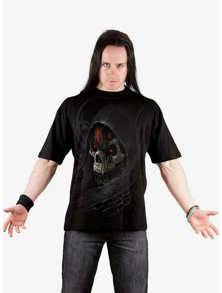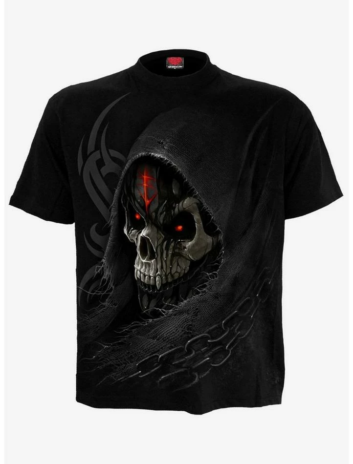 The blackened, dripping tar of mortality drips continuously from the skeletal mask of Death. Blood red eyes splinter the darkness, while the ever-tightening chains suffocate and imprison. These are the end times, and we are the marked few. T-Shirt Black is made of Top Quality 100% Cotton, Jersey using skin friendly, Azo-free, Reactive dyes.