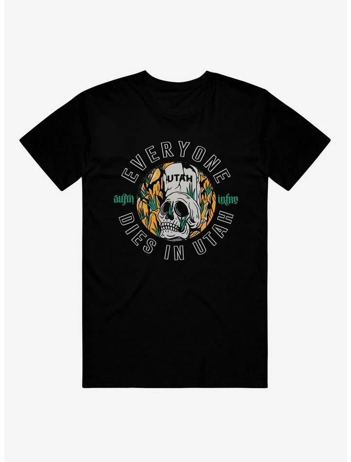 The music of Everybody Dies in Utah is so hypnotizing, and so is this tee. It features the band’s name ringed around a graphic of a tombstone reading “Utah” with a skull on the grass in front of it.