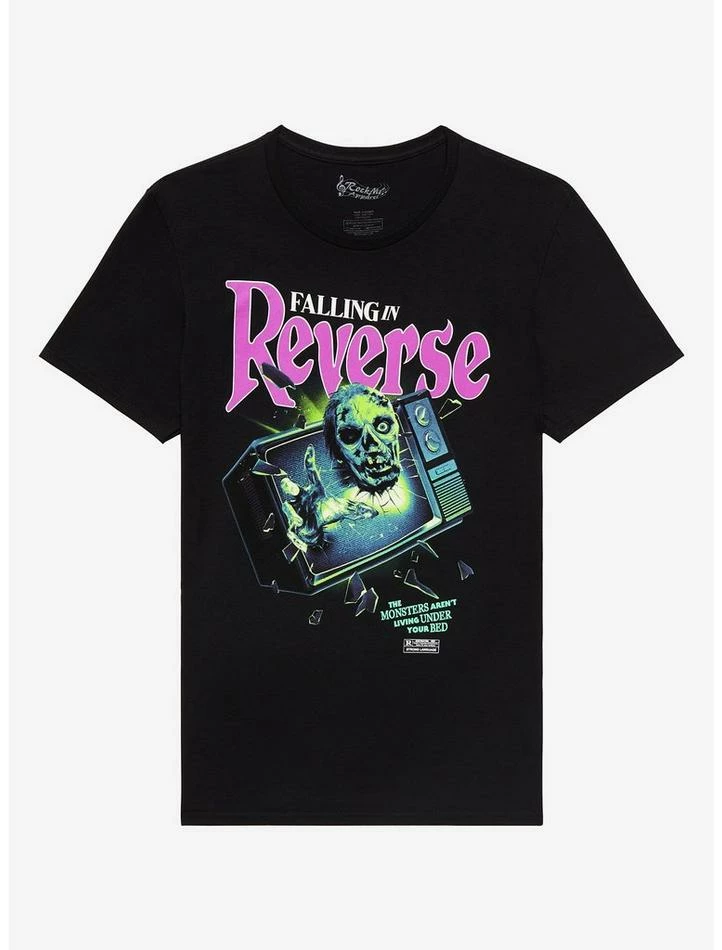 They won’t stop ’til everybody’s zombified! Break out with this Falling in Reverse tee, featuring a graphic inspired by “ZOMBIFIED” of a zombie bursting out of a TV in bright tones. “The monsters aren’t living under your bed” is printed on the bottom with a parental warning box.