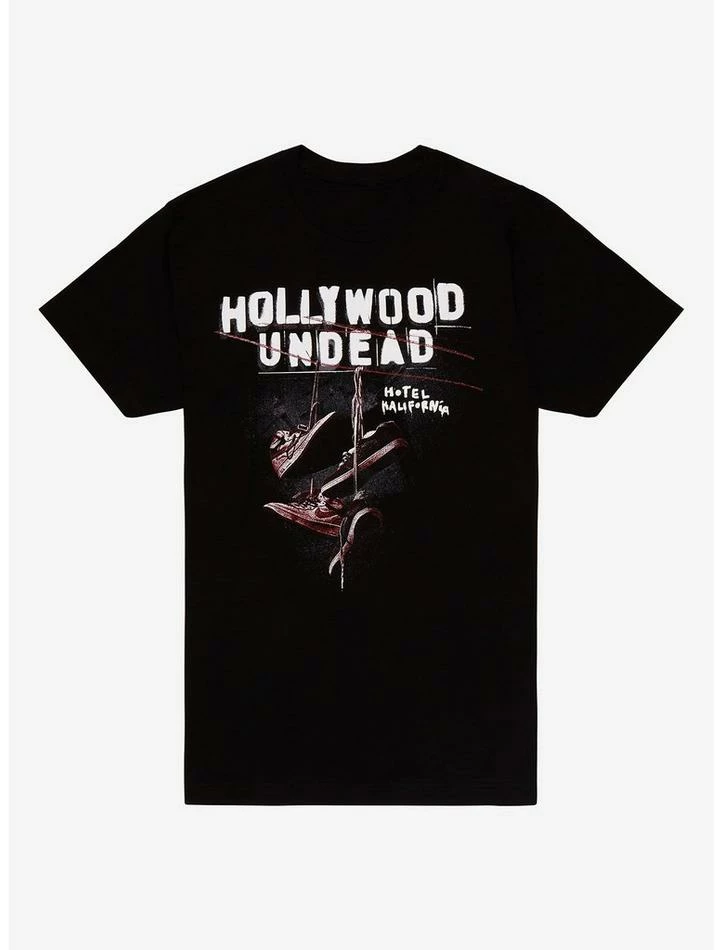 Are you hyped for Hollywood Undead’s newest album? Us, too! Rep Hotel Kalifornia with this tee! Featuring old sneakers hanging from powerlines, plus the band’s name and album title.
