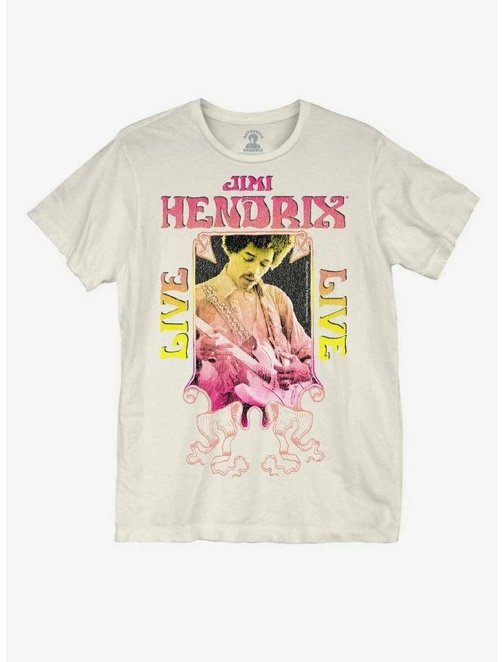 When it comes to guitar gods, Jimi Hendrix is the one who sits on the throne. Groundbreaking in every way, his work was and still is ahead of its time. This tee shows a replica design of groovy tour art.