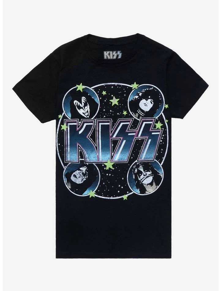 KISS Army, it’s time for a fresh tee. This style has a vintage-style graphic of the members’ faces framing the logo with stars sprinkled throughout.