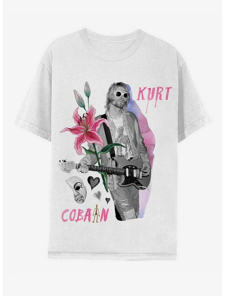 The man, the icon, Kurt Cobain. This tee is fitting of the legend, showing a supercool portrait of Cobain surrounded by hearts, a lily and a half-mask.