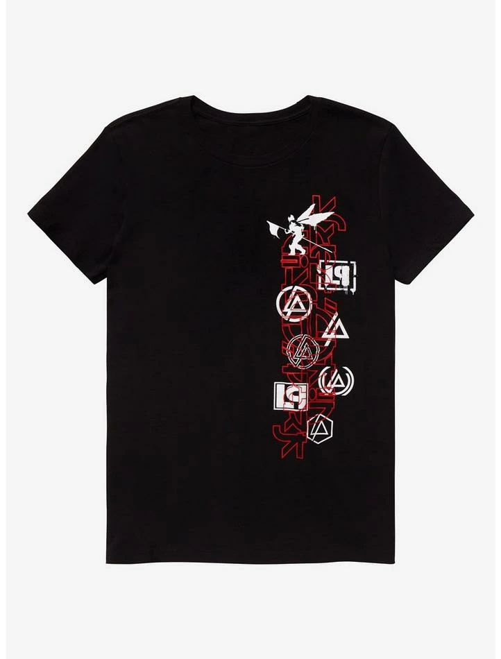 Show your love for every Linkin Park era with this tee! Featuring all of their logos printed over red Japanese text down the left side.