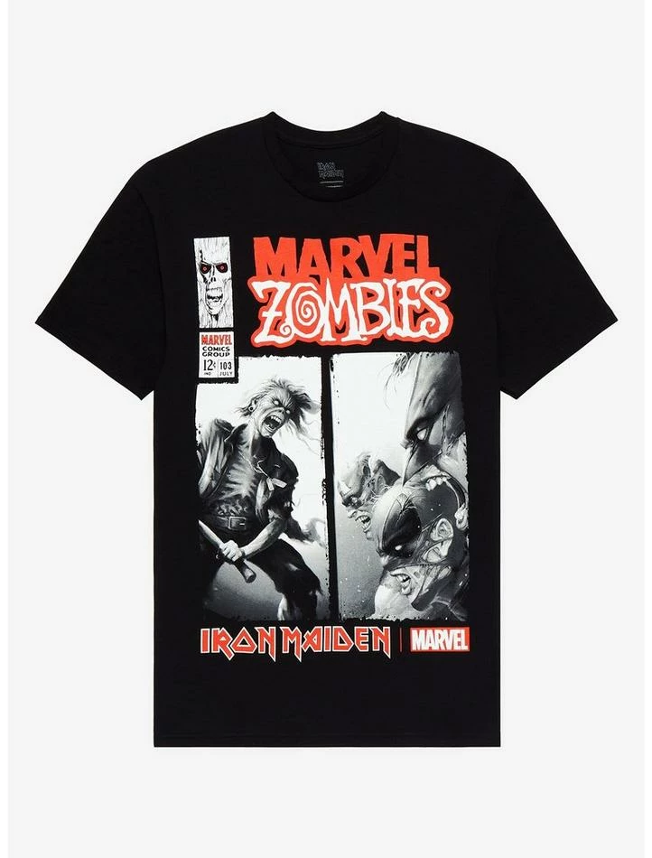 The Marvel Zombies are coming for Eddie, and it will be an epic death match. We’re so into this collab between Marvel and metal legends Iron Maiden. Both have created entire worlds where we can escape from reality. This tee features a a comic book-style graphic of Eddie vs. Marvel Zombies, with the Marvel Zombies logo above and the collab logos below. The back features the Maiden and Marvel logos.
