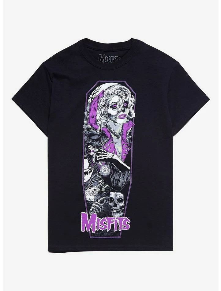 It’s a fiend party on this Misfits tee! It features a coffin-shaped frame containing different versions of the Crimson Ghost and a Vampira-esque woman at the top wearing fiend makeup. The band logo is below.
