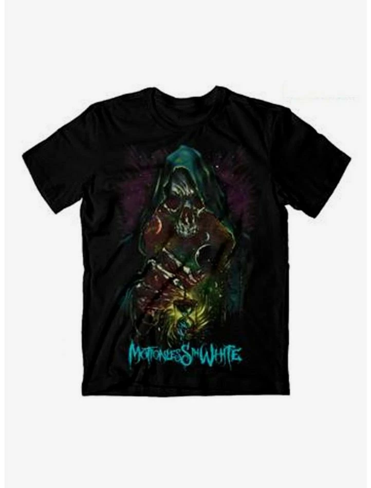 Tick Tock. Better snag this Motionless In White tee before the Grim Reaper says time’s up! This black tee depicts the Grim Reaper holding an hour glass and the band’s text logo below.