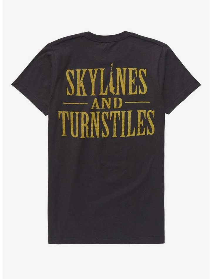Celebrate 20 years of listening to MCR’s classic, “Skylines and Turnstiles” with this tee! Featuring artwork inspired by their debut album, I Brought You My Bullets, You Brought Me Your Love. “Skylines and turnstiles” is highlighted on the back. Rep this tee at the next concert!