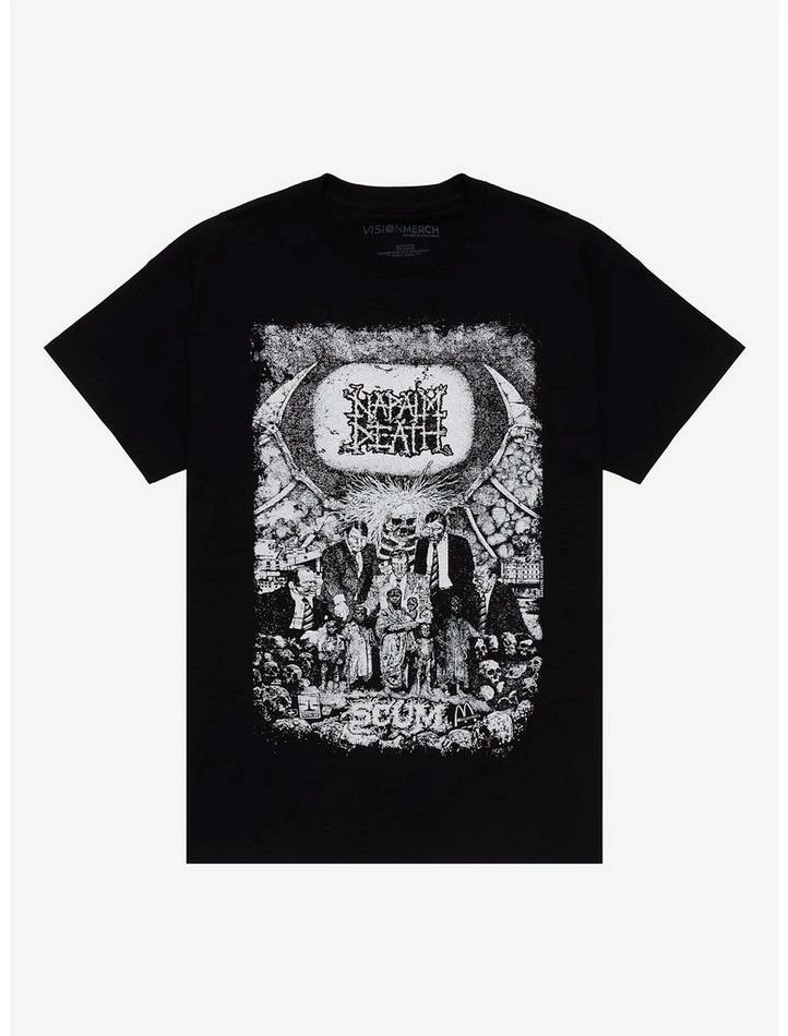 Throw it back to the beginning of grindcore legends Napalm Death with this Scum tee. Dropped in 1987, Scum is Napalm Death’s debut album and immediately established them as progenitors of the extreme metal movement that would follow. This tee features the intricate album art.