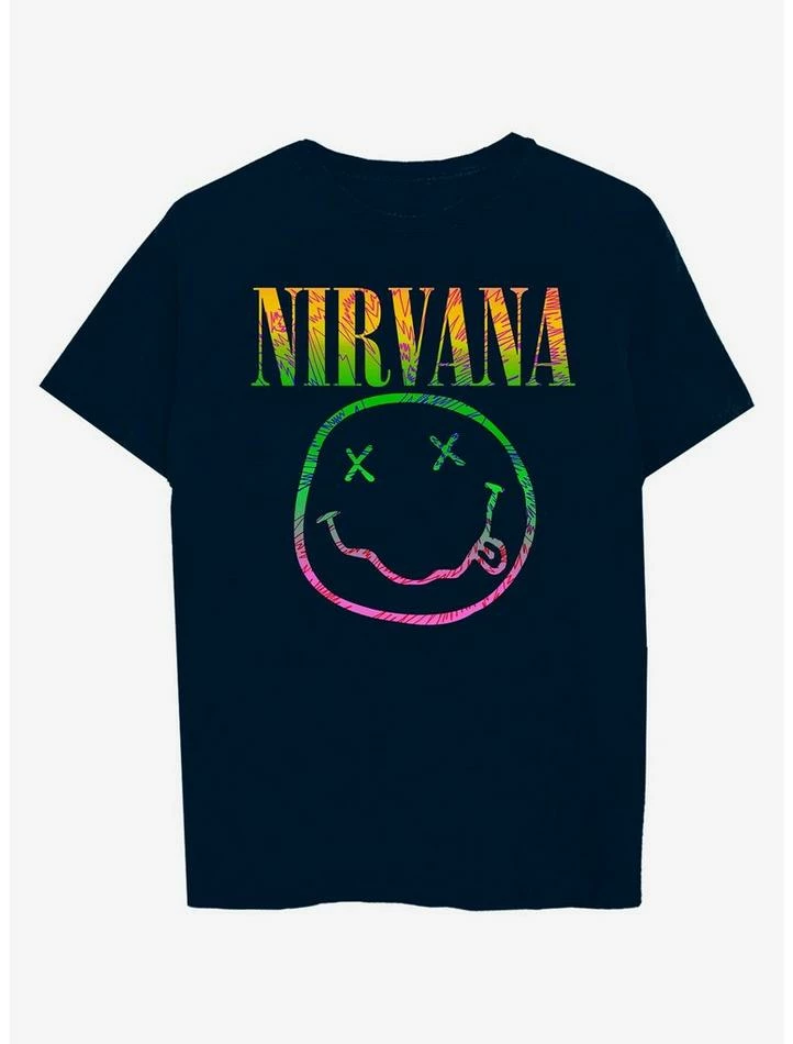 New Nirvana tees are in bloom. This one features a colorful Nirvana logo and their smiling face logo on the front.