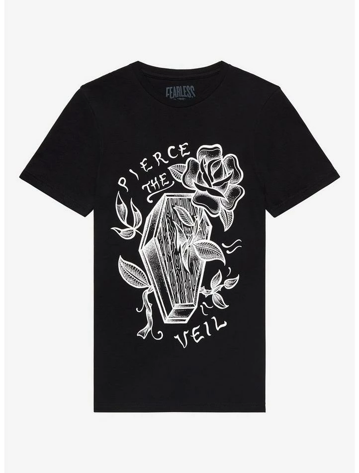 It’s been awhile since new music from Pierce The Veil, but the band’s finally back and you need a fresh tee for the moment. This tee shows the classic design of a coffin surrounded by roses.