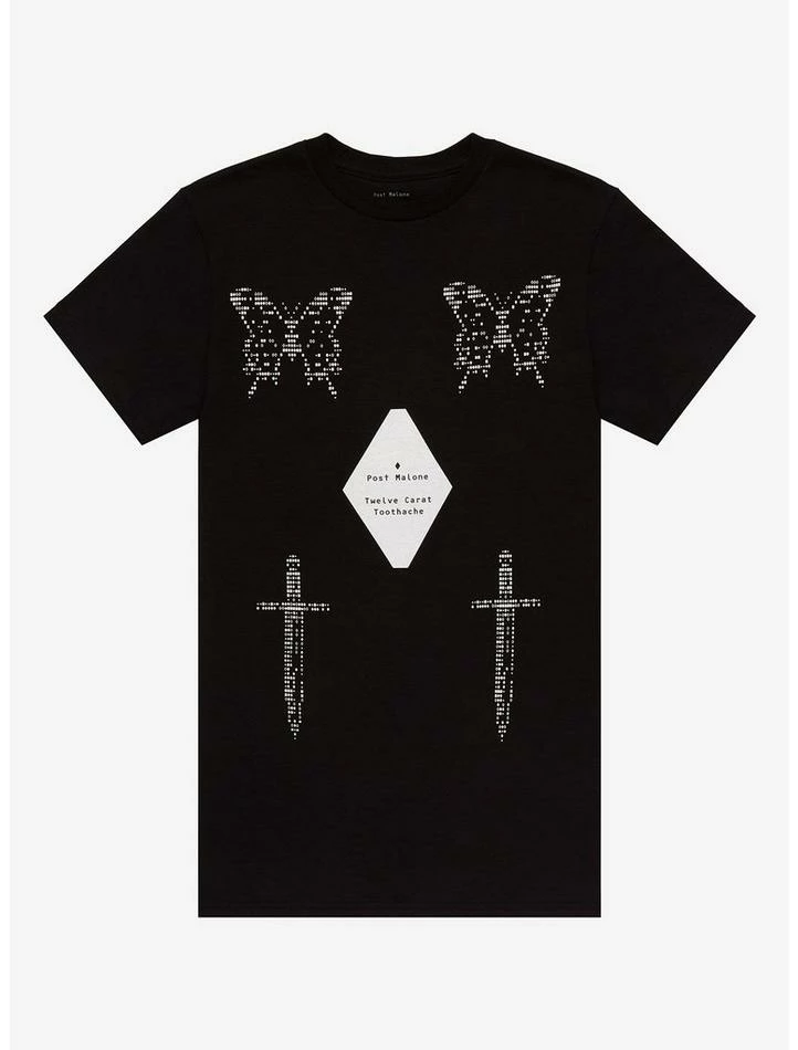 Put on Posty’s Twelve Carat Toothache (2022) while you get dressed and reach for this tee, featuring glitchy graphics of butterflies and daggers, inspired by the album’s cover.
