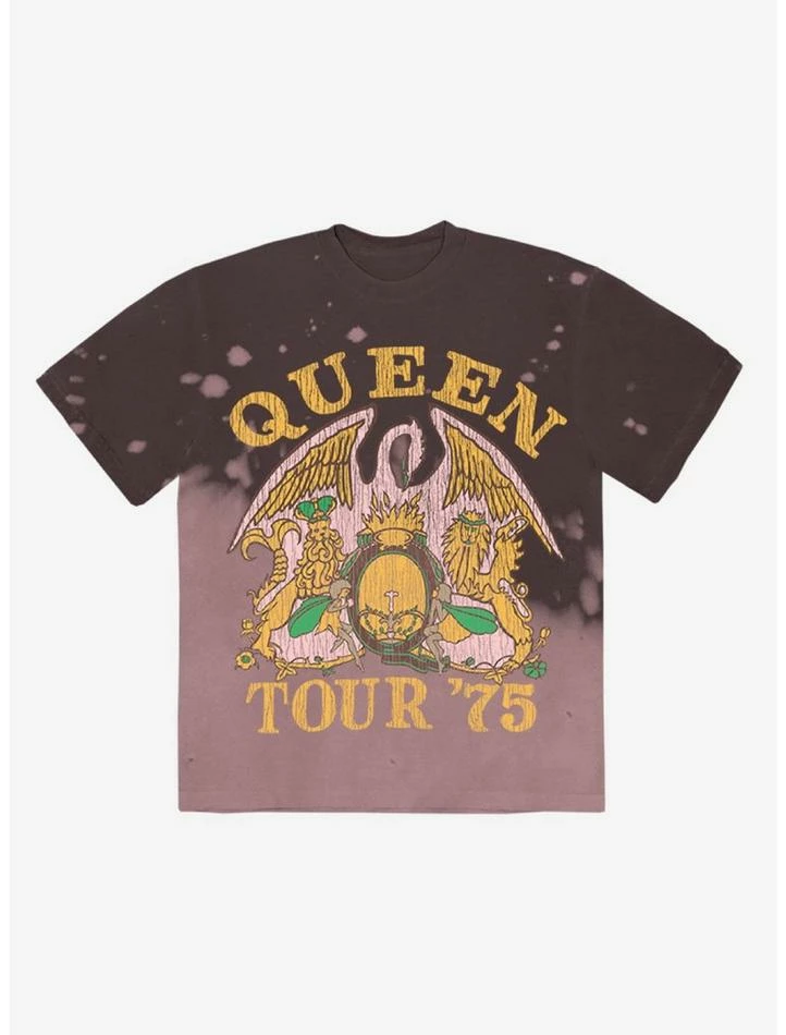 Make some noise with your favorite quartet in this Queen tee! Inspired by their A Night at the Opera tour, this dip-dye tee features a distressed print of the band’s logo, framed by “Queen” and “Tour’75.”