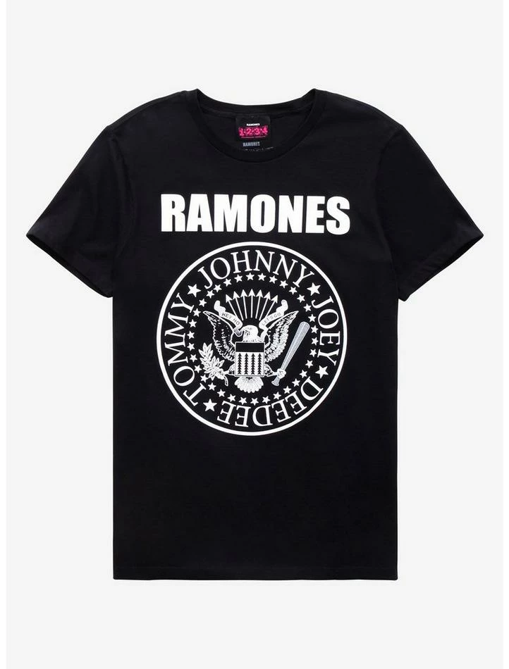 A Hot Topic exclusive! This black T-shirt has a front screen featuring the Ramones seal logo.