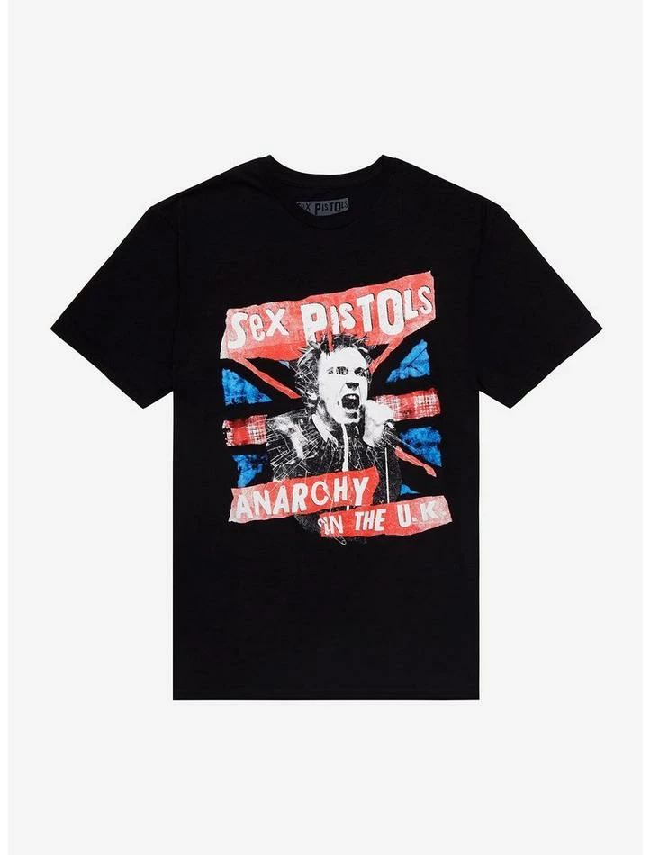 Add some anarchy to your closet with this Sex Pistols tee! Featuring a distressed print of Sid Vicious over the Union Jack, with their band name and “Anarchy in the U.K.” printed in a punk font.