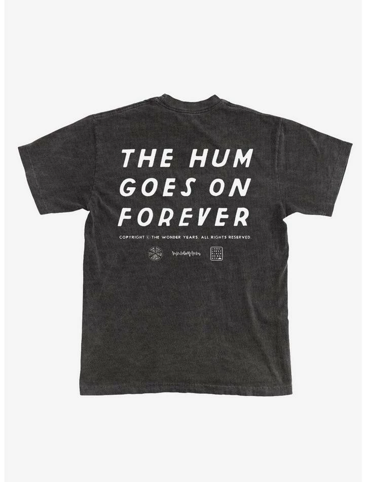 The Wonder Years’ new album is finally here — now you need the merch to match! The Hum Goes On Forever appears in text on the back, with the band’s name on the front chest.