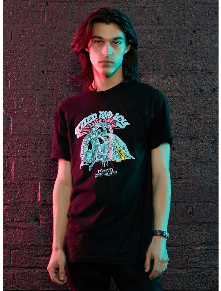 Shhh… don’t awaken Trash the Dragon! Unless it’s with Twenty One Pilots music. This black tee features “Scaled and Icy” text design with Trash as seen from the album cover.